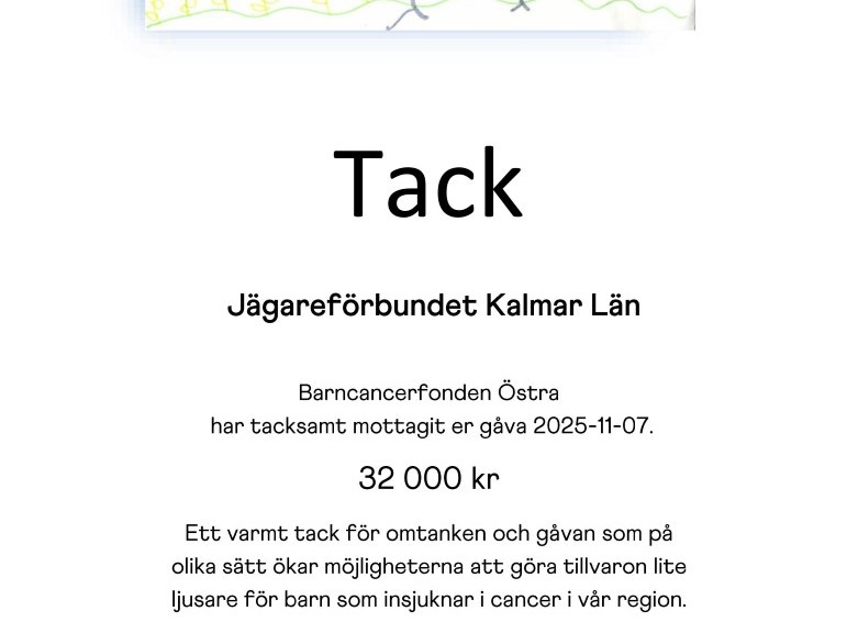 Jägareförbundet Kalmar län har utsett Barncancerfonden Östra som förmånstagare till våra veksamheter då vi anser att de gör ett otroligt fint och viktigt arbete i vår region.